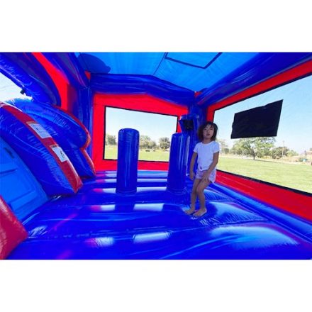 All American boxing dual lane combo packs a punch! With a basketball goal, obstacle pops, climbing wall and dual lane wet slide that finishes with a pool bottom it has everything you need! This unit measureĀ 31L x 13W x 15H. We definitely recommend a truck or trailer for this unit. A mini van will work but an suv may not be able to accommodate its size.