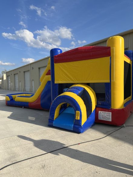 This unit is equipped with a double slide, climbing wall to access the slide and a basketball goal! Able to be used wet or dry its perfect all year long. This unit measures 29Lx16Wx14H when inflated. when picking up the equipment a truck or trailer is required. The unit will fit in a mini van if all seats lay down and are flush but will not fit in a suv.