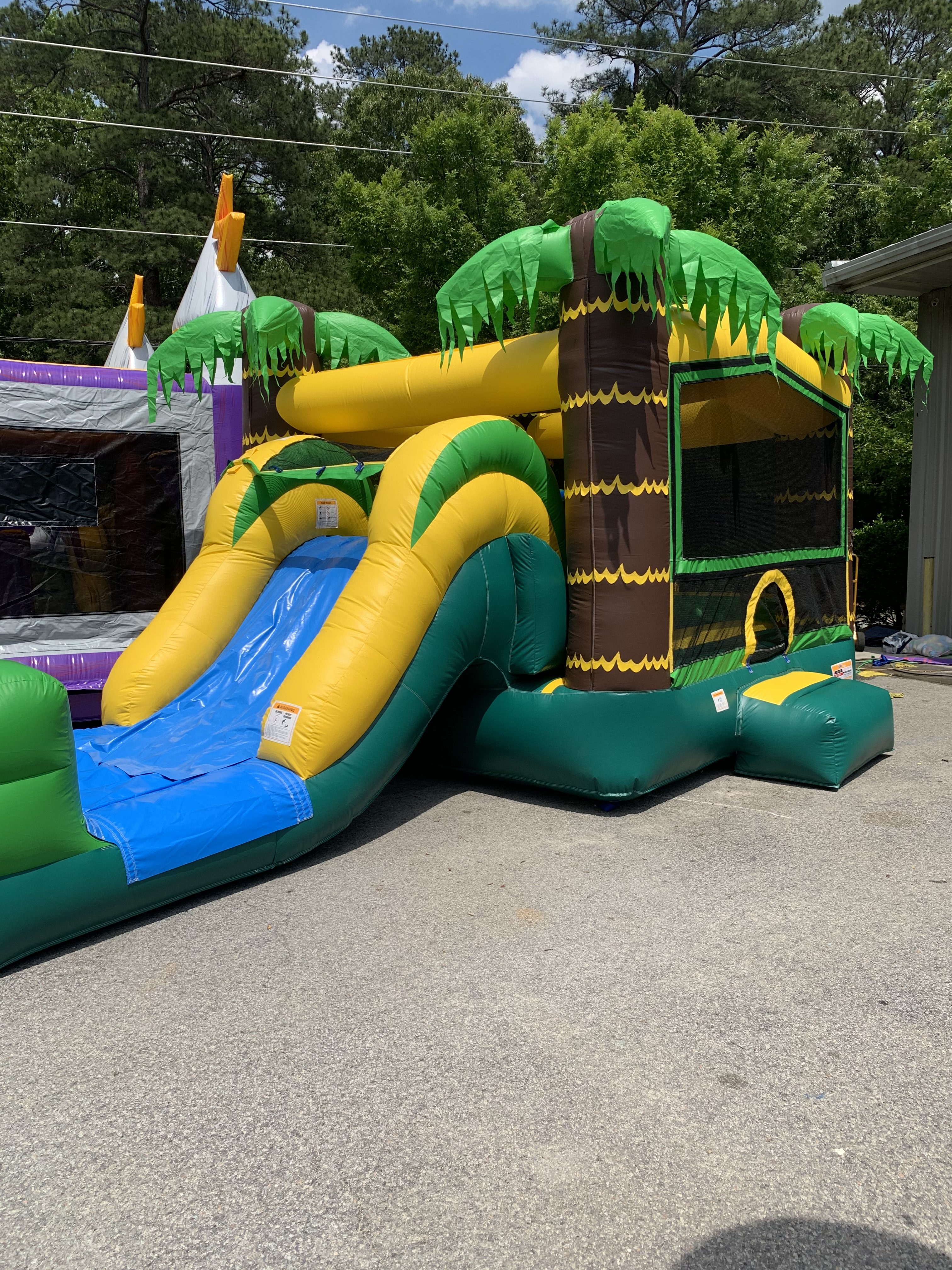 This safari combo includes a basketball goal, climbing wall, and the ability to use the slide wet or set. Measuring 26L x 13W x 15H when inflated it’s perfect for all but focuses on younger riders.